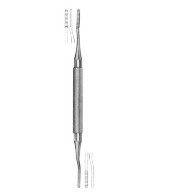 Used to remove or smooth rough edges of alveolar bone during surgical procedures. Straight-cut Bone Files are used with a pull stroke. Cross-cut Bone Files can be used with a push-pull motion.